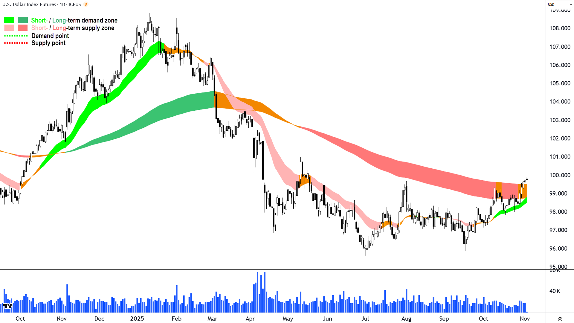 Короткострокові та довгострокові трендові стрічки: ⬇️ / ↔️, розширення короткострокового спадного тренду (посилення) проти довгострокового скорочення (послаблення), ціна нижче обох стрічок, і обидві стрічки діють як зона динамічної надлишкової пропозиції = ⚠️.