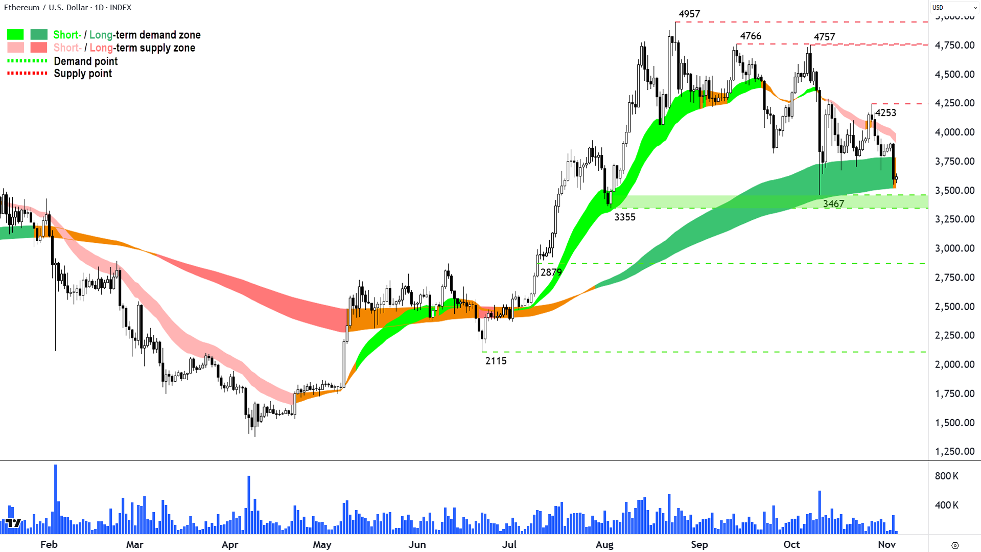 Ключові рівні: 3355-3467 є найближчою зоною попиту, ціна не повинна закриватися нижче, якщо сторона попиту зберігає контроль над ціною біткойна; зростає ймовірність того, що стрічка короткострокового тренду (наразі 3915-3994) і стрічка довгострокового тренду (наразі 3525-3785) виступатимуть зонами динамічного постачання.