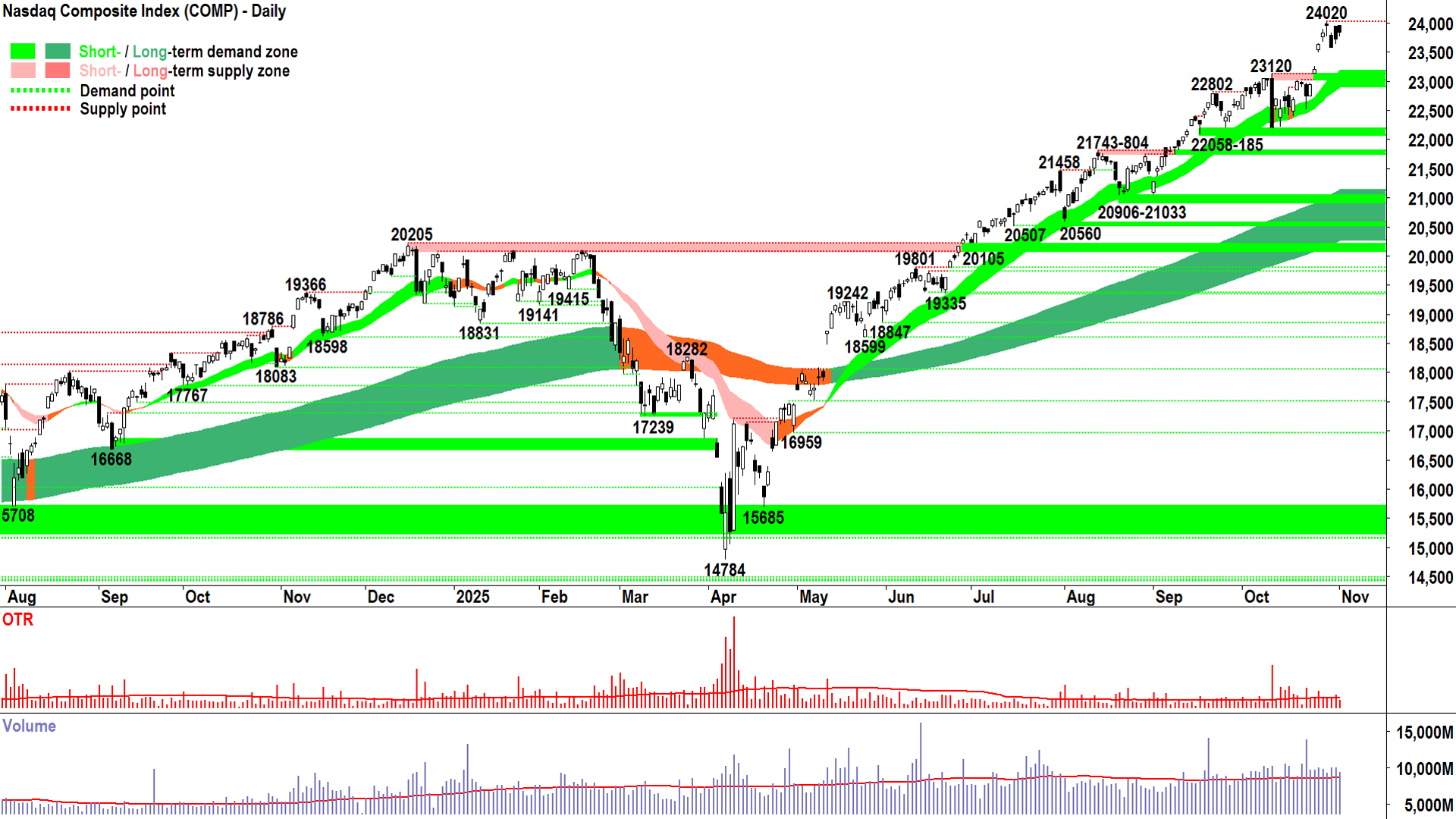 Ключові рівні: 23120 є найближчою точкою попиту, ціна не повинна закриватися нижче, якщо сторона попиту контролює ціну Comp; закриття нижче короткострокової стрічки висхідного тренду (наразі 22900-23180) зведе нанівець короткостроковий висхідний тренд = ⚠️